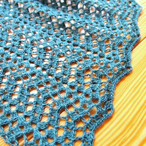 このブルーグリーンを、秋用に編み始めたものの編みあがらなくて